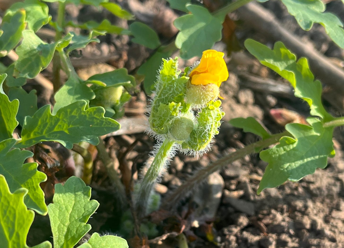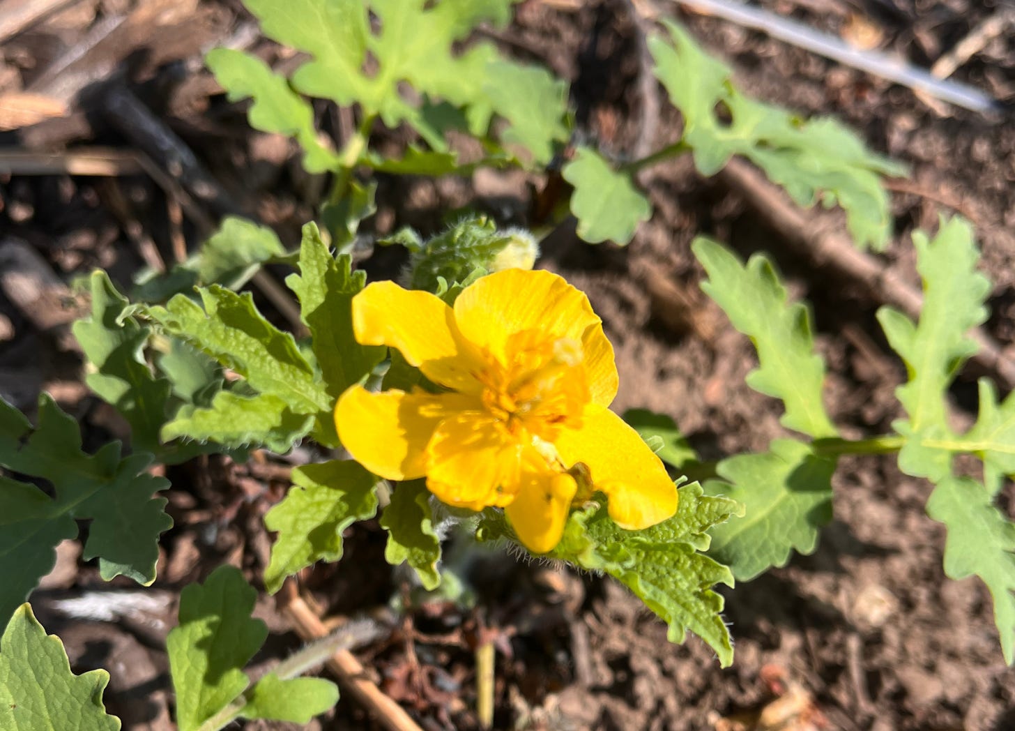 On Monday, a tiny dollop of yellow at the edge of my vision pulled my attention - celandine poppy (stylophorum diphyllum). Its first bud, all fuzzy and yellow, still turned in on itself. Just beginning to unfold.